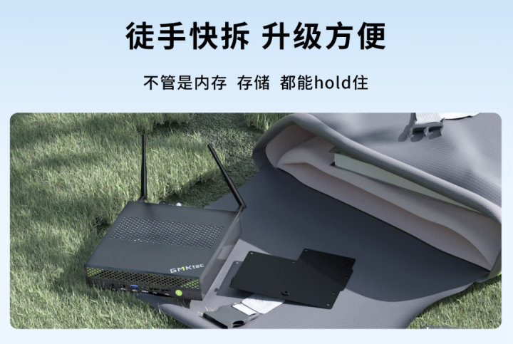而极摩客K10与普通迷你主机的不同之处在于,它采用了更符合迷你服务器,或者说是迷你工作站的外观设计,沉稳黑色机身,可立可卧,前面板还有绿色的网格点缀,一眼就是满满的专业商务范儿。