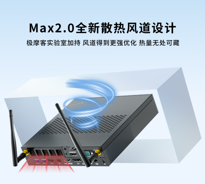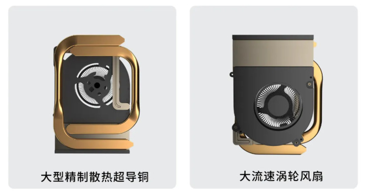 极摩客K10采用顶部进风,尾部出风的散热通道设计,内置大流速涡轮风扇和双热管,可以在45W、54W和65W三挡功耗释放间自由切换。