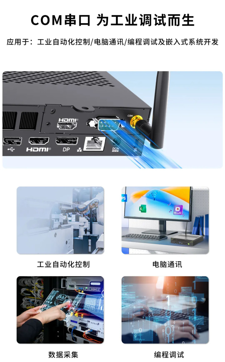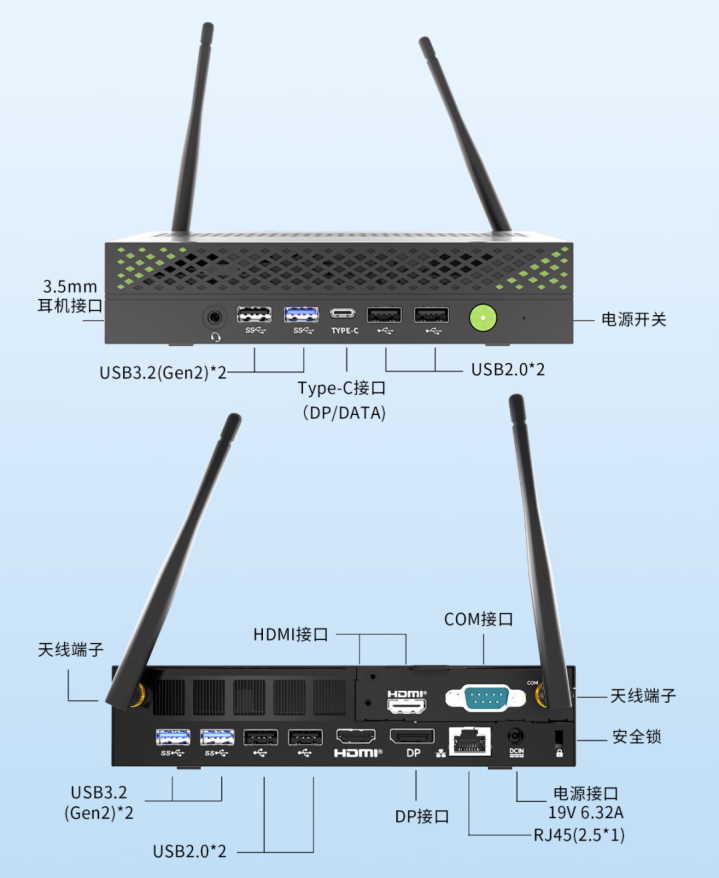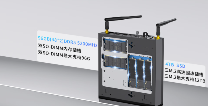 该产品提供了丰富的接口,包含4个USB-A3.2 Gen2,4个USB2.0,支持视频输出的USB-C,2个HDMI,DP,RJ45,COM串口,音频接口,电源插孔。独立的双频外置天线也格外醒目,可以带来更稳定的网络连接性能。